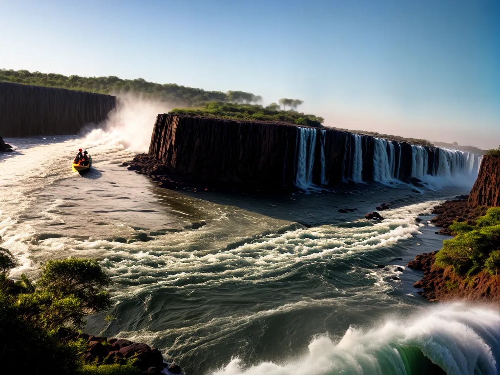 Ilustração Gráfica inspirada no artigo – Foto: Antesdemorrer.comDescer as impressionantes cataratas do Iguaçu é uma experiência única e emocionante. Imagine-se em um barco, navegando pelas águas turbulentas e sentindo a força das quedas d’água. O vento no rosto, o som ensurdecedor e a sensação de adrenalina correndo pelas veias. É uma aventura que vai te deixar sem palavras. E o melhor de tudo é que você pode fazer isso tanto do lado brasileiro quanto do lado argentino das cataratas. Então, se você é daqueles que adoram uma dose de emoção, não pode deixar de incluir essa experiência no seu roteiro pela região. Se prepare para se molhar e viver momentos inesquecíveis!